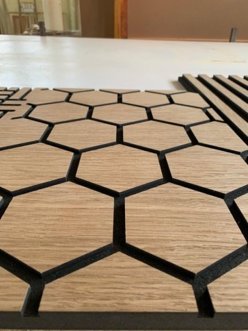 Akustický ART obraz s použitím rezu V-cut do felt panelu s drevenou 3D fóliou. Rozmer 600x1200x9, 50mm .