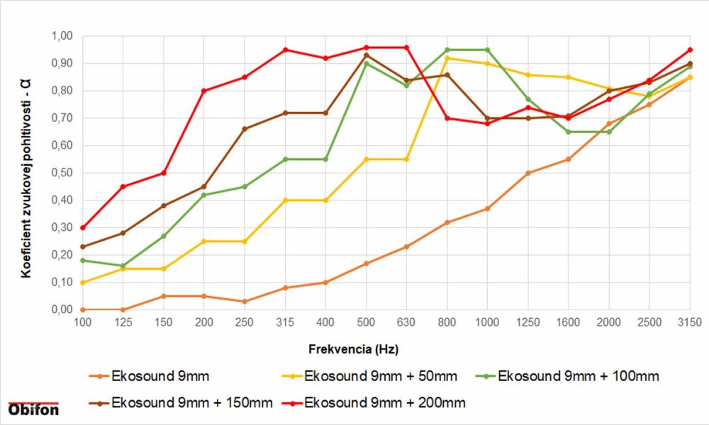 Graf zobrazuje porovnanie akustickej účinnosti PET panelov hrúbky 9mm s odsadením od steny