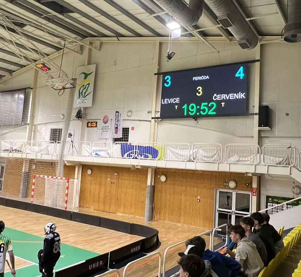 Druhou halou kde su aplikované naše panely je športová hala Levice s panelmi Akustišport 50mm. V oboch halách sú na stenách za brankami natiahnuté siete aby nedošlo k poškodeniu panelov ich znečistením.