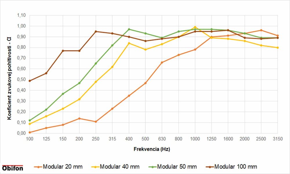 Prikladám graf zvukovej pohltivosti kde dve šrafované čiary ohraničujú oblasť kde má byť hodnota dozvuku po frekvenciách. Ako vidieť realizácia splnila očakávania a výsledné hodnoty sú v požadovanom pásme. Fakt,že hrúbka panelov bola 100mm stiahol dozvuk aj v basovej oblasti /80-200Hz/ čo je dôležité práve pri hudobných vystúpeniach. Prikladám graf pohltivosti pre panely v rôznych hrúbkach kde je vidieť hodnoty podľa hrúbok panelov.