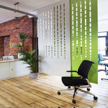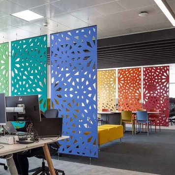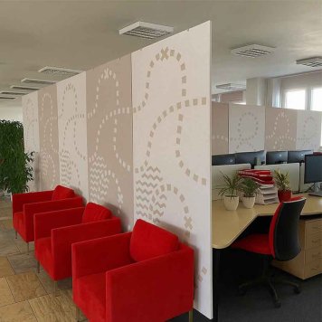Deliace akustické paravany Soundscreen ART sa používajú v priestoroch kde je potrebné vizuálne predeliť priestor s potrebou zníženia hlučnosti v priestore. Môžu byť plné alebo s frézovaným vzorom podľa vzorkovníka alebo s dodanou grafikou. Dodávajú sa zo závesným lankovým systémom.