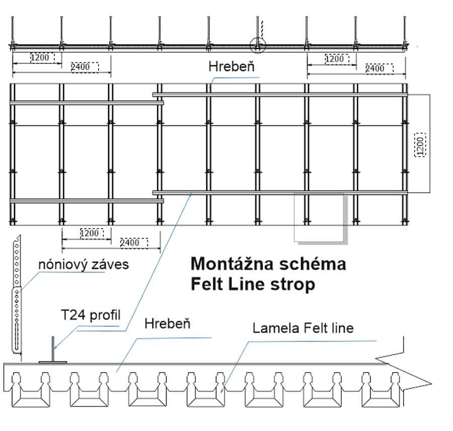 V prípade potreby väčších roztečí lamiel doporučujeme Felt hrebeň.Jedná sa o kotvenie lamiel do filcoveho hrebeňa rovnakej farby ako lamely,ktorý je možné vešať zo stropu.Výhodou je rovnaka farba hrebeňa,design a možnost individuálnej rozteče medzi lamelami. Lamely su rovnako ako pri kovovom hrebeni vyberateľné.