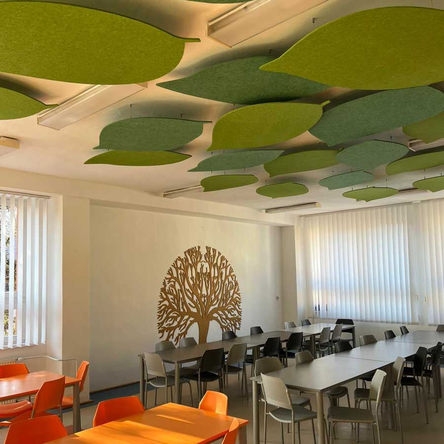 Na výrazné zlepšenie akustiky postačuje pokryť 40% stropu akustickými panelmi. Pre ešte lepší efekt odporúčame panely odsadiť od stropu pomocou elegantných závesných laniek.